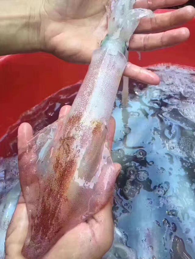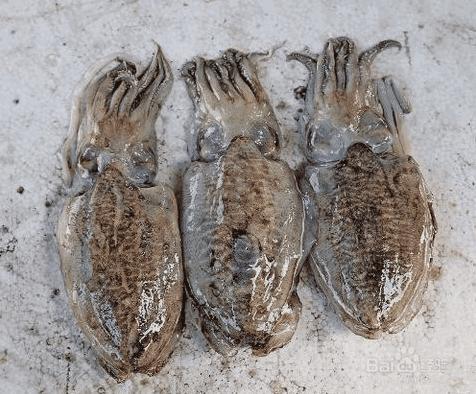 魷魚,也叫海兔子,體圓錐形,體色蒼白,有淡褐色斑,頭大,前方生有觸足10條,尾端的肉鰭呈三角形